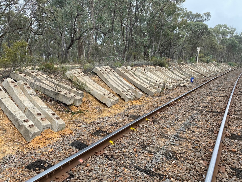 Sleeper preparation March 26, 2026 ~ jacksnorkelle Another successful day preparing and laying out concrete sleepers. A scene that we’ve become accustomed to. Monday’s workday will start at Maldon 8am Share this: Share on X (Opens in new window) X Share on Facebook (Opens in new window) Facebook Like Loading... Related
