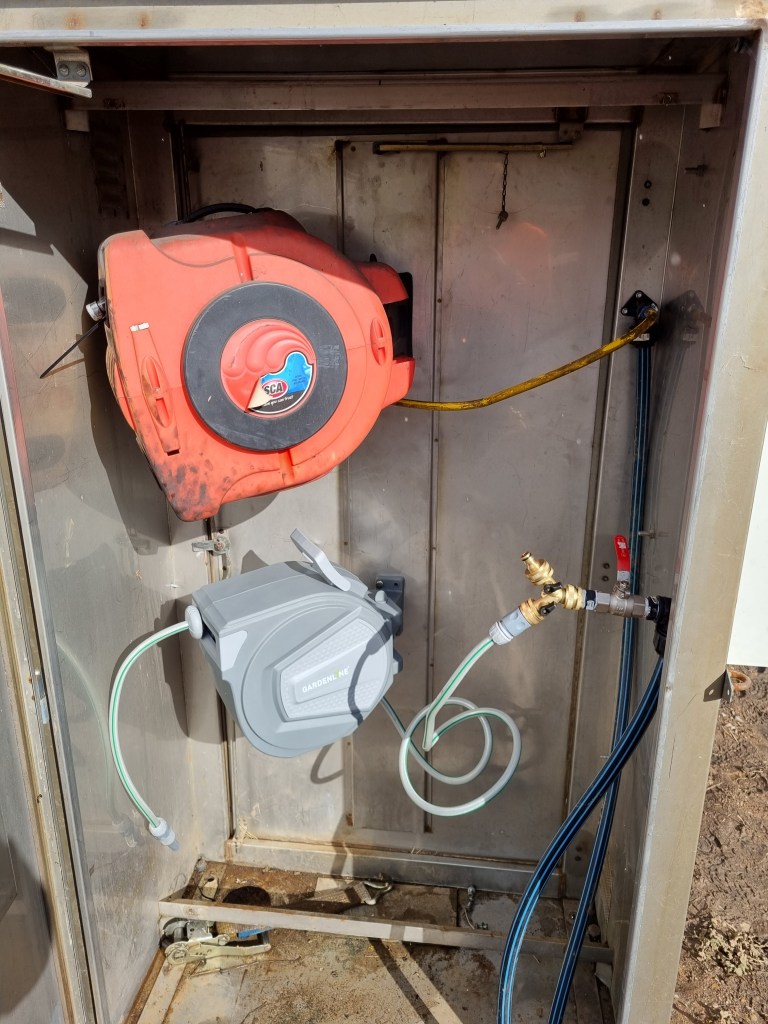 We can now wash the ice off the windscreens on a cold morning (hopefully being in the cabinet will stop the water supply from freezing too). The air supply is to pump up the truck tyres, which inevitably need doing on a regular basis. Hopefully this will make life just that bit easier. We might even fit an external tap so you can give you hands a quick rinse.